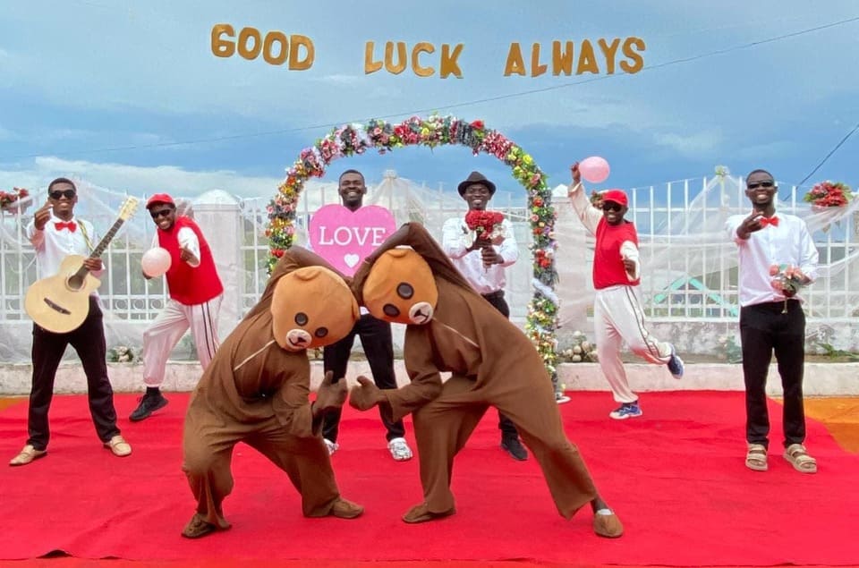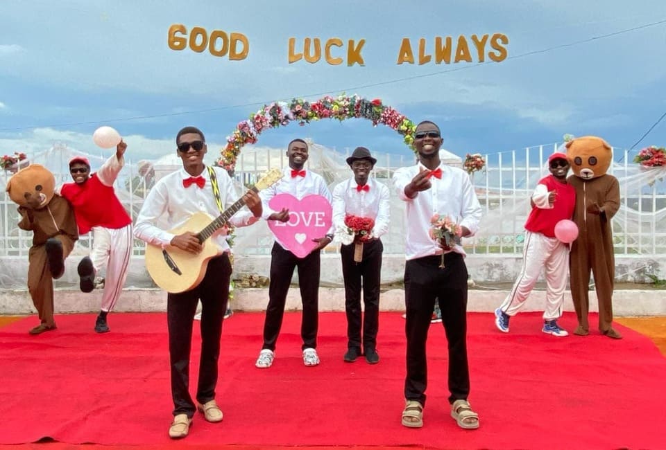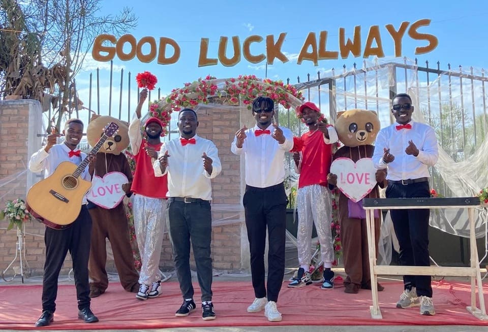 Очаровательные и романтичные парни поют под гитару и поздравляют без диктора в компании двух плюшевых медведей